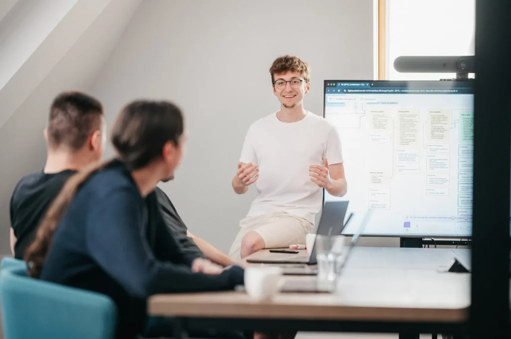 Atmosféra je otevřená a přátelská. Lidi v týmu spolu vzájemně komunikují a ochotně si pomáhají. Prostředí je hodně neformální, ale zároveň profesionální, což mi vyhovuje.